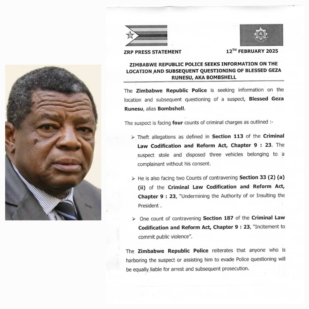 The Zimbabwe Republic Police (ZRP) has issued a public appeal for information regarding the whereabouts of Blessed Geza Runesu, also known as “Bombshell,” who is wanted in connection with multiple criminal charges.